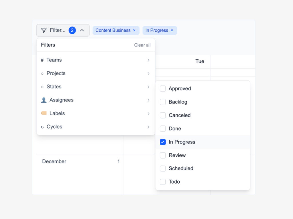 • Filter by team, assignee, project, label, current/upcoming cycle