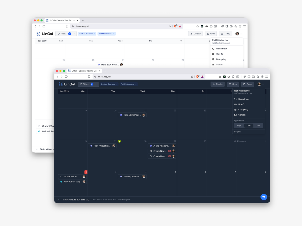 Until now, LinCal followed your system’s light or dark mode automatically. Now you can override it and pick your preferred theme—Auto, Light, or Dark mode.