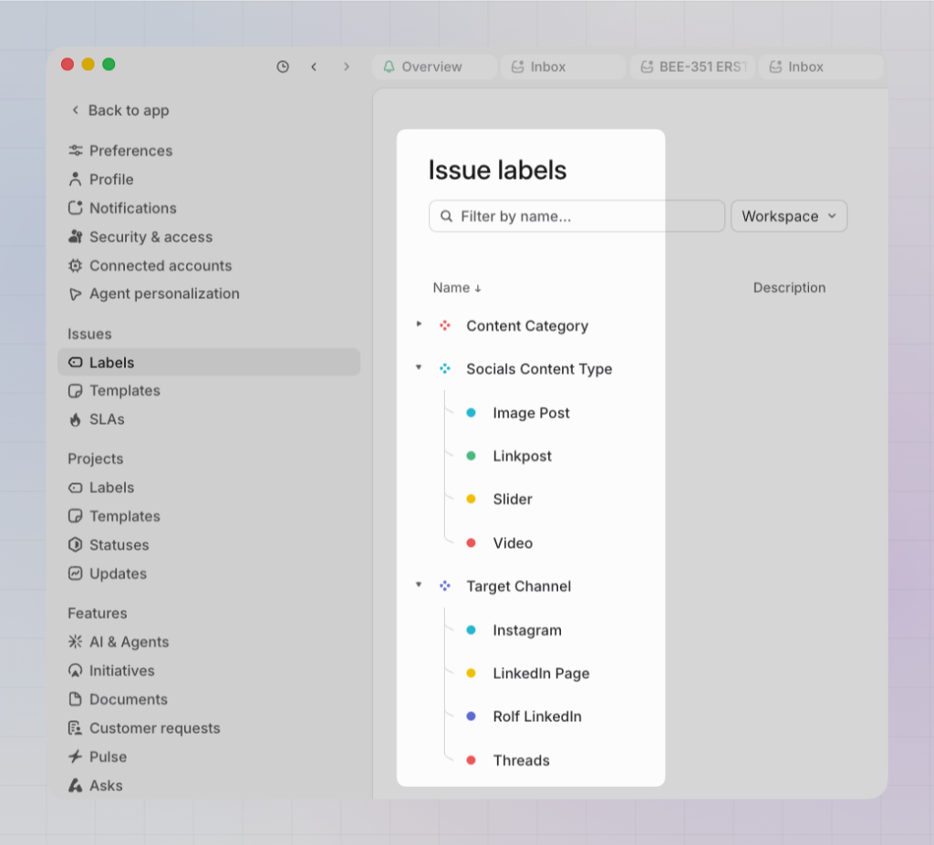 If you’re a small team running content as an ongoing effort, start with a single Linear team and use labels to categorize your content by channel.