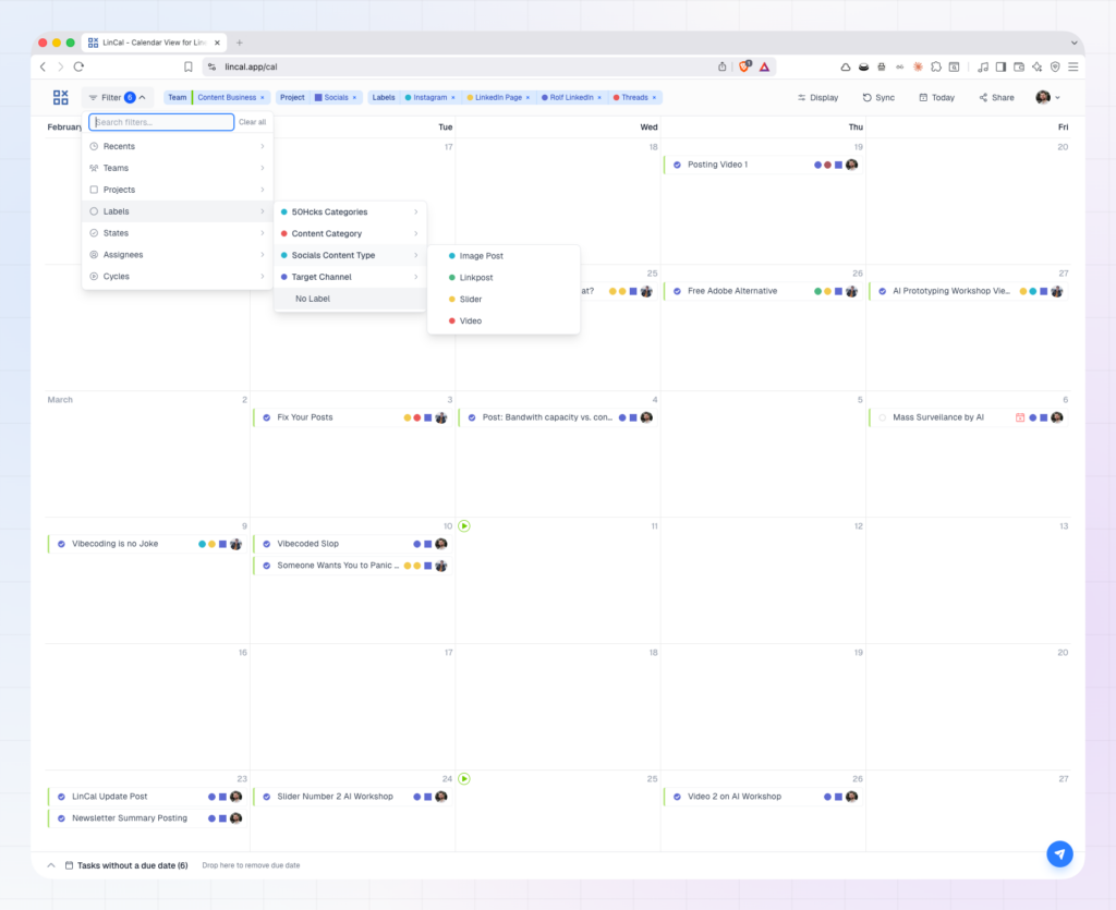 LinCal is a calendar interface for Linear that lets you view your tasks laid out by due date. You can build a filter that matches your content setup, combining teams, labels, projects, and assignees, and share that view with your whole team via a URL.