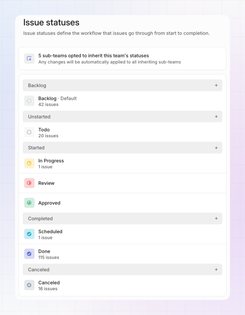 Out of the box, Linear’s workflow states cover the basics. For content work, it’s worth adding a few custom statuses to reflect how content actually moves from idea to publishing.